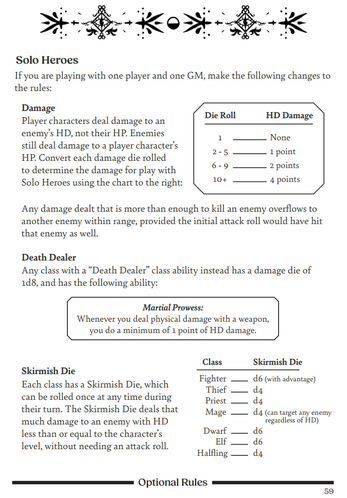 - Solo Hero rules inspired by “Scarlet Heroes” from Sine Nomine Publishing: https://www.drivethrurpg.com/product/127180/Scarlet-Heroes